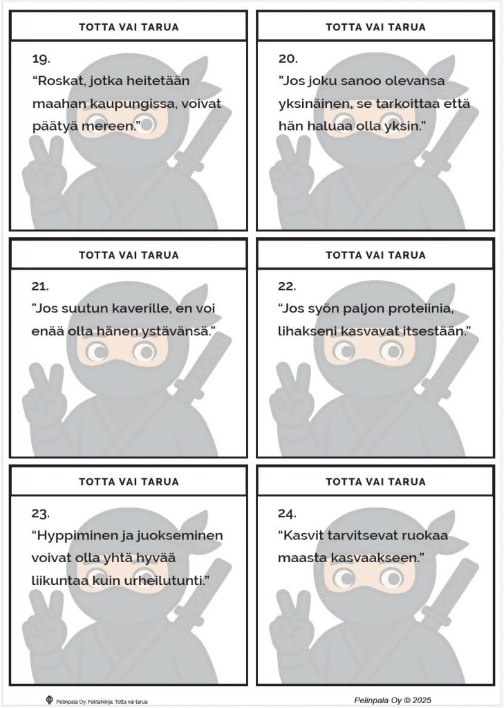 FaktaNinja on tulostettava Totta vai tarua -peli, joka harjoittaa kriittistä ajattelua ja medialukutaitoa erilaisten väitteiden kautta. Peli kannustaa lapsia ja nuoria pysähtymään, pohtimaan ja perustelemaan vastauksiaan – olipa kyse arjen ilmiöistä, yleisestä tiedosta, uskomuksista tai netissä vastaan tulevista väitteistä. FaktaNinja sopii erinomaisesti keskustelun herättäjäksi luokkaan, pienryhmiin ja kotiin.